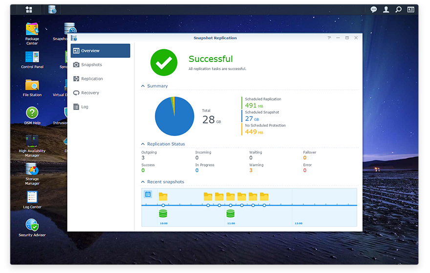 先進(jìn)的 Btrfs 文件系統(tǒng)于特定 NAS 機種上支持新的快照技術(shù)。Snapshot Replication 讓你可頻繁地將數(shù)據(jù)從主要備份地點復(fù)寫到異地存儲空間 - 最多可以每 5 分鐘備份共享文件夾,每 15 分鐘備份 LUN,確保你存儲在共享文件夾的重要機密或 iSCSI LUN 中的虛擬機能從災(zāi)難事件中快速地復(fù)原。