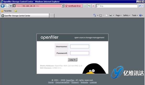 Openfiler 鏡像系統(tǒng)配置當(dāng) Openfiler 系統(tǒng)安裝并重啟完成后,對系統(tǒng)所有后續(xù)的配置過程,都是以 Web 方式配置完成的。這種全部基于 Web 的系統(tǒng)配置方式,使得配置過程變得更加簡易,同時也帶來了良好的用戶體驗(yàn)。首先打開瀏覽器,輸入地址:https://IP:446。注意,此處輸入的 IP 地址為在系統(tǒng)安裝時所配置的固定 IP 地址。然后使用系統(tǒng)初始默認(rèn)的用戶名和密碼進(jìn)行登陸。用戶名為 openfiler,密碼為 password。系統(tǒng)初始的用戶名和密碼可以在第一次登入系統(tǒng)后進(jìn)行重新設(shè)置。如圖所示。