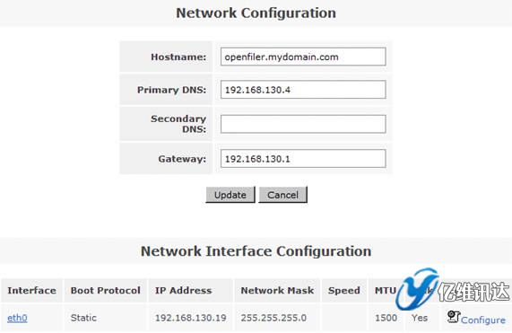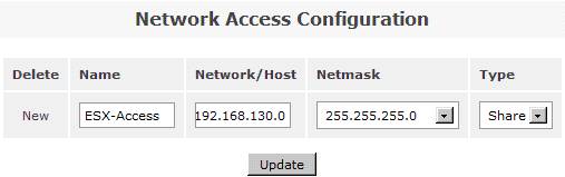 在系統(tǒng)菜單“System”菜單下的“Network Access Configuration”區(qū)域,配置允許訪問 Openfiler 系統(tǒng)的安全訪問控制列表。值得注意的是只有加入到 Openfiler 的網(wǎng)絡(luò)訪問控制列表中的網(wǎng)絡(luò)或者主機(jī)地址,才允許訪問 Openfiler 系統(tǒng)所提供的虛擬存儲服務(wù)。在網(wǎng)絡(luò)訪問控制列表中,既可以配置網(wǎng)段地址也可以配置單個主機(jī)地址。在本例填入 192.168.130.0 網(wǎng)段,設(shè)置類型為“Share”方式,添加完成后點(diǎn)擊“Update”完成系統(tǒng)配置更新。如圖