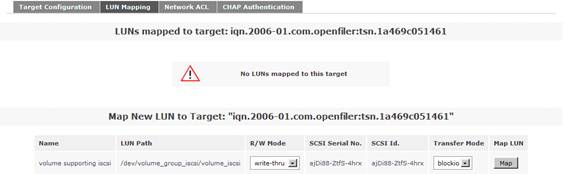 接下來點(diǎn)擊“LUN Mapping”子菜單,保持其余默認(rèn)選項(xiàng),點(diǎn)擊“Map”選項(xiàng)。從而實(shí)現(xiàn)從 LUN 到剛剛配置好的 iSCSI Target 之間的映射。如圖